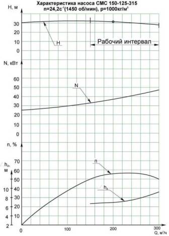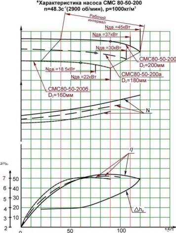 В таблице приведены технические характеристики насоса СМС 80-50-200 в базом исполнении и с обточками рабочих колес ("а", "б") и насос СМС 150-125-315.